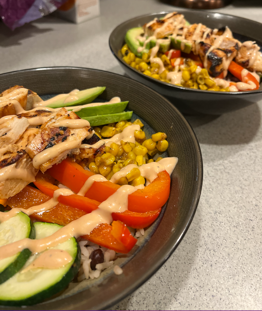A great thing about this recipe and something that is always a winner in my book is it is so versatile. You can use whatever meat or seafood you would like as your protein, switch up the grilled vegetables, and use whatever type of corn (or none at all) you like. You can also change the dressing to fit your taste buds, I would love to try this with the chipotle ranch the next time I make this for a little kick. For this particular bowl I used zucchini, red bell pepper, avocado, and a bag of Mexican street corn from the frozen section. It was what I had in the refrigerator and what will be growing in my garden this summer so I will most likely use this combination again but feel free to try something new.